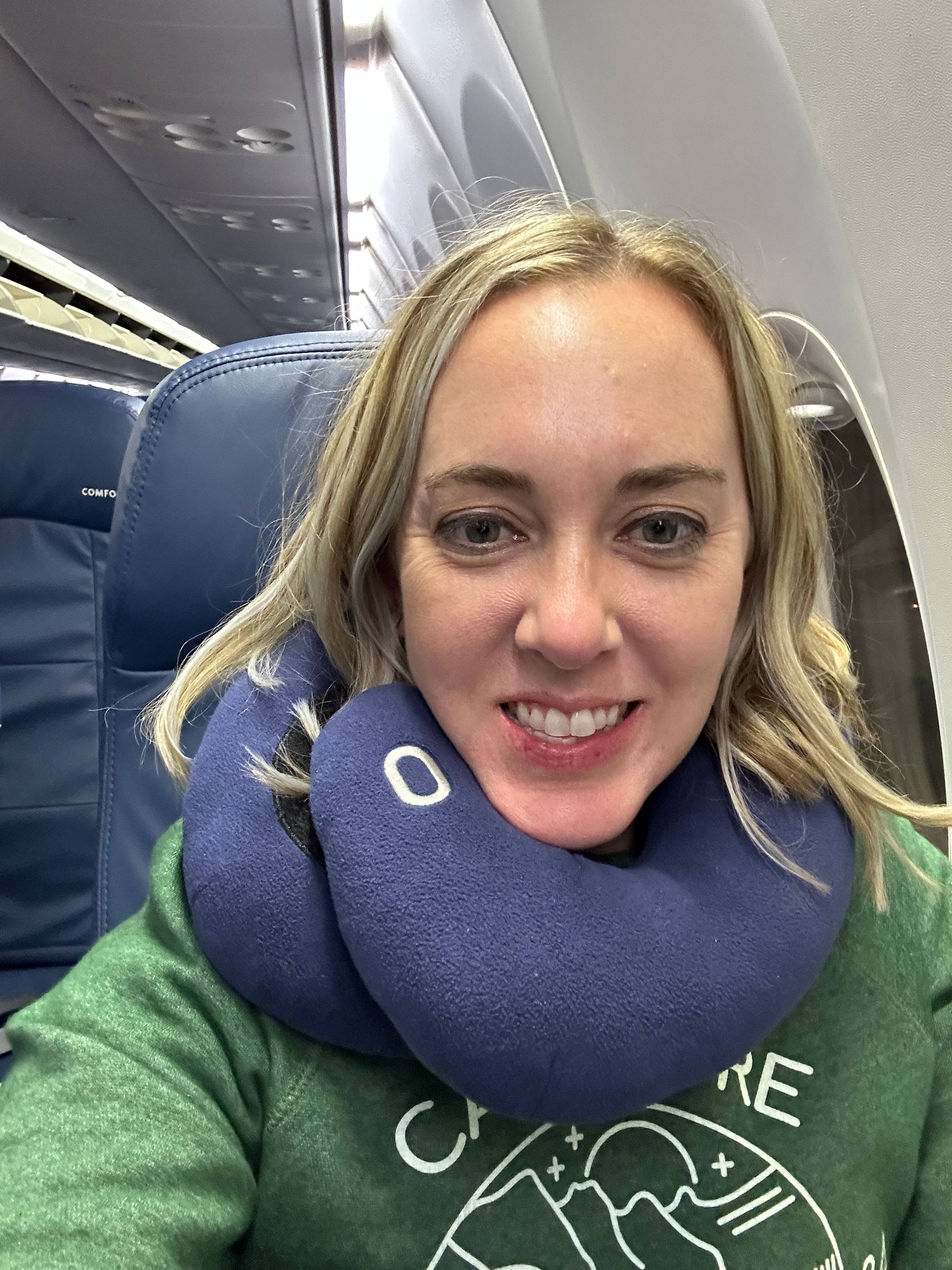 Let's be real, the worst part of traveling is a long haul flight, and you're probably not flying in business class. I love this travel pillow! It's foam so it won't get holes in it, and it has different configurations.